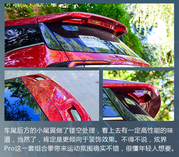 对于这个价位的车型来说,很容易忽略了设计的重要性,或只是型像神不像的套娃,以至于产生浓浓的廉价感。很庆幸炫界没有,而炫界Pro更进一步提升抓住了年轻化风格,并在成本之内尽可能的将之实现了。外形细节上的这一套组合拳打下来,确实带来了很不错的运动氛围,对于炫界Pro,外形已经是比较大的购买吸引了。