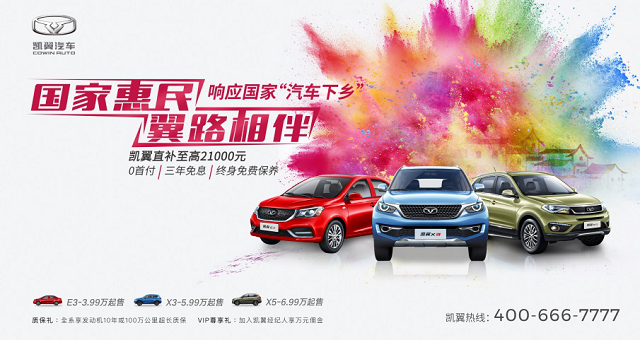 凯翼汽车作为自主品牌的一股新生力量,成立5年来一直致力于驾乘体验的改善与汽车智能互联的提升与应用。县乡及农村市场一直都是凯翼汽车重点关注、重点布局的方向。其现阶段的主销产品凯翼X5、凯翼X3以及凯翼E3,以其稳定可靠的的性能、贴心实用的配置、以及合适的价格区间,都与“汽车下乡”对产品的需求高度匹配。可以说凯翼汽车此次顺势而为,推出“汽车下乡”专项系列优惠政策,将在凯翼产品现有的优良口碑加持下,实现凯翼品牌在县乡及乡村市场的占有率的进一步提升。