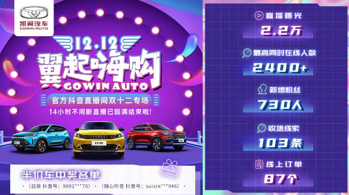 本次双十二,凯翼汽车在线上平台开展的多项趣味新玩法,吸引了消费者的广泛关注。其中在抖音开启的超级直播中,视频达人的趣味联动以及多轮互动大奖,让不论想不想买车的网友都被“黏”在了直播间,部分幸运值爆表的用户还抽中了轩度半价车,直接将直播间的气氛推向高潮。整场直播下来,累计曝光2.2万,斩获线上订单87个,实现了人气销量的双丰收。