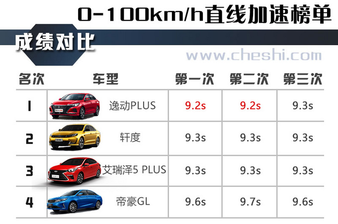 零百加速成绩是汽车性能的一项重要指标,除了能反应发动机的性能外,还与传动系统的匹配有着莫大关联。测试车辆均在同一环境同一地点下,全油门计时出发,由专业仪器记录其达到时速100km/h瞬间的时间,每辆车共测试三次取其平均值,数值越小者获胜。