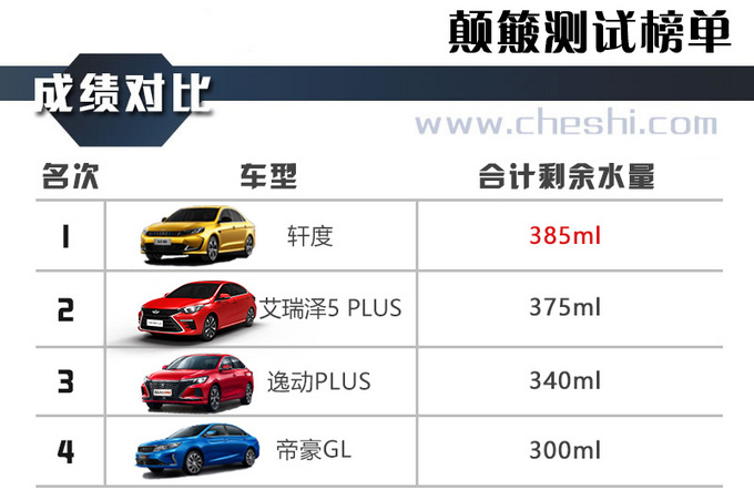 在我的印象中,对于售价在10万元以内这个价位的车型来讲,其舒适性不会相差太大,尤其是面对这种以30km、60km的时速通过长减速带时,都会产生较大的颠簸。但从此次的测试数据来看,轩度依旧给了我们很大的惊喜,车内有着很好的滤振效果,换言之就是有着较高的舒适性,其前后双独立悬挂可谓起到了关键性的作用,整体底盘的调校在提供一定运动性的前提下,最大程度的保障了车内的舒适性,多连杆独立后悬挂对路面的颠簸做到了有效控制,最后以总计385ml的水量赢得比赛。