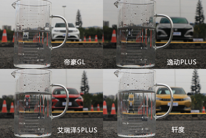 除了车内噪音外,底盘的滤振效果同样是影响舒适性的重要因素,为了模拟车辆日常行驶在烂路或是过减速带时,车内的滤振效果更为明显直观,本次测试通过美女模特手持两个装满水的玻璃杯并乘坐在车内,测试车辆分别以30km、60km的时速通过减速带,最后测量两个水杯的剩余水量总和,以剩余水的多少来衡量车内的颠簸程度,剩余的越多或洒出的越少,证明其车内颠簸幅度越小,车内的舒适性也就越好。