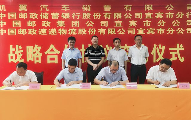 7月31日,凯翼汽车和中国邮政签署了战略合作协议,建立合作伙伴关系,未来双方将在金融、保险、仓储物流、品牌推广、企业采购等方面全面开展合作。中国邮政储蓄银行宜宾市分行行长周伟、中国邮政集团公司宜宾市分公司总经理熊静、中国邮政速递物流股份有限公司宜宾市分公司总经理张承志、凯翼汽车销售有限公司副总经理周强、宜宾凯翼汽车有限公司财务总监张昊等相关领导出席此次签约仪式,共同见证此次战略合作的达成。