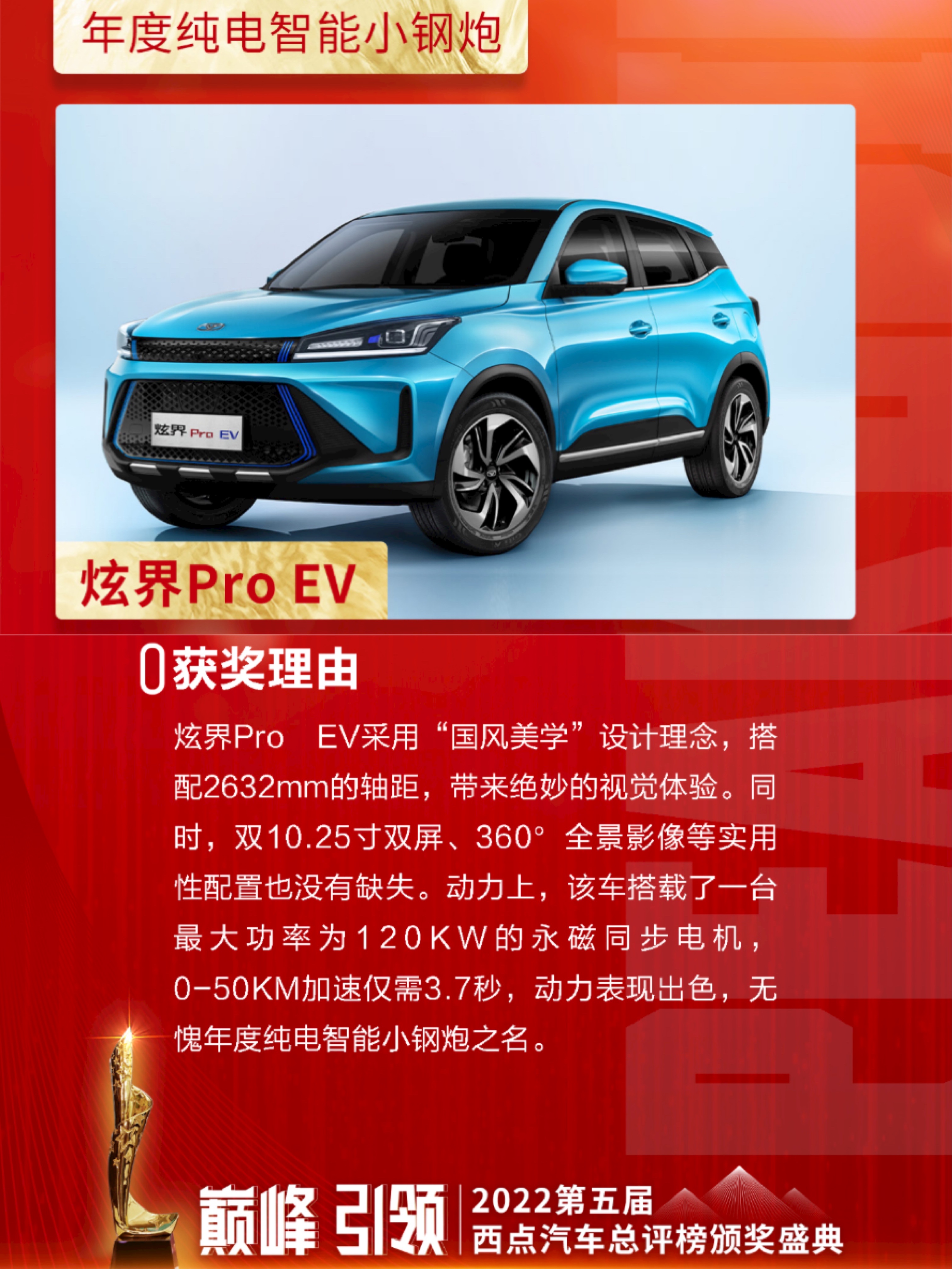 凯翼汽车旗下新能源重磅产品炫界Pro EV荣膺“年度纯电智能小钢炮 ”大奖。炫界Pro EV是一款年轻时尚的智能纯电SUV,配备宁德时代磷酸铁锂电池,401KM超长续航;智能科技,双10.25吋酷炫双屏、超高清360°全景摄像头;外观运动、内饰精美,上市以来深受消费者欢迎,并于6月22日完成“电动宜宾 翼享生活”炫界Pro EV第一批500台出租车交付活动,助力“电动四川”。