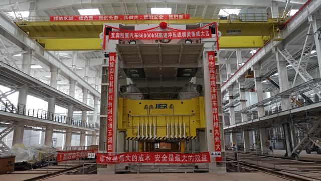 据了解,宜宾凯翼高速冲压线是一条66000kN大型自动化高速冲压线,由5台济南二机床压力机与瑞士GUDEL双臂自动化机械手组成,生产节拍可达15次/分钟,同时配备先进的数字化MES系统,实现智能化生产及管理,同步国际先进水平。冲压产线的建成,将承担新能源电动汽车及燃油车车身大型覆盖件、大型结构件的生产。