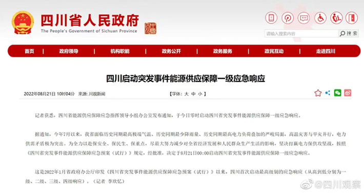 高温横行,导致用电超强负荷,为保障民生用电需求,四川省首次启动最高级别的应急响应,要求各党政机关、企事业单位全面采取了系列节能节电等措施,毕竟朋友圈的“空调”总是有些辣眼睛。