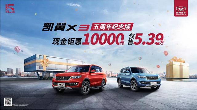 据悉, 8月28日是凯翼汽车品牌的五周年纪念日,同时凯翼汽车也开启了“凯翼礼赞70华诞,购车享8重豪礼”的钜惠活动,献礼国庆答谢消费者。活动期间,凯翼汽车推出凯翼X3五周年纪念版,现金钜惠10000元,仅售5.39万。在金九银十的佳期,引爆购车热情,尽享有车生活。