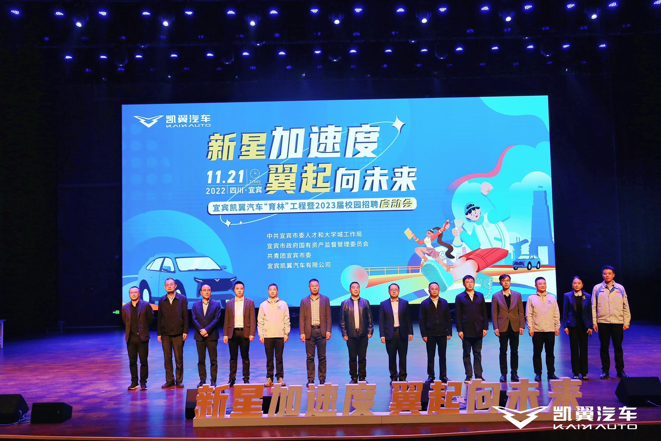 11月21日,凯翼汽车“育林”工程暨2023届校园招聘启动会正式在西华大学宜宾校区拉开帷幕,中共宜宾市委人才和大学城工作局副局长曾振华,中共宜宾市国有资产监督管理委员会委员会副书记蒋廷清,共青团宜宾市委副书记魏平强,临港经开区党工委委员,市新兴产业投资集团党委书记、董事长,凯翼汽车公司党委书记刘彬,以及西华大学、西南交通大学、成都理工大学、四川轻化工大学 、成都工业学院、四川外国语大学、电子科技大学、宜宾学院等高校的相关领导和嘉宾出席了本次活动,现场参与本次启动会的还有凯翼汽车各级领导及各大院校近千名学生。