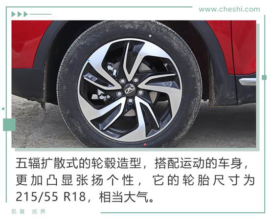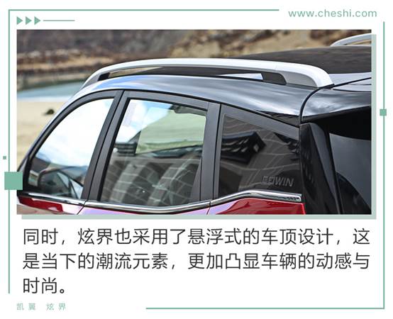 侧面来看,凯翼炫界的运动气息更加凸显,分体式腰线的勾勒,营造出张扬的个性,动势横飞。而当下流行的悬浮式车顶造型,黑红双色的配色,以及造型动感的18寸铝合金轮毂,都令炫界有着明显的年轻标签,潮流气息扑面而来。