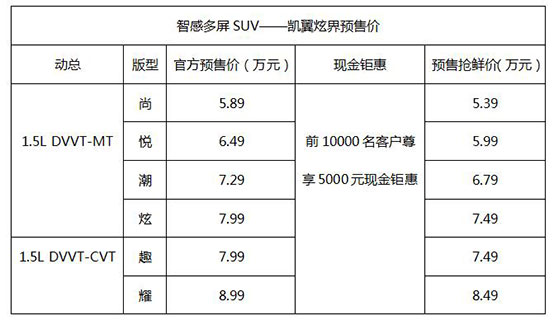 预售期间,预定炫界的前10000名客户除了可尊享5000元现金钜惠之外,还可尊享六重豪礼:1、金融礼:尊享2年0利息、5年超长贷,至高享5000元贴息,多种金融套餐随心选;2、置换礼:尊享至高3000元置换补贴,置换无忧;3、安心礼:尊享价值2999元精品礼包;4、惊喜礼:尊享订车抽取炫界半价购车权:5、流量礼:尊享5年免费,无限流量放肆用;6、质保礼:尊享整车10年/30万公里超长质保,一次购车终身无忧。