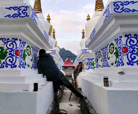 攀谈之间,我们得知,久经日晒、雨淋、风吹的白塔已有10余年未经翻新,所以,三位藏族画匠的任务就是用画笔和颜料让白塔重焕生机。