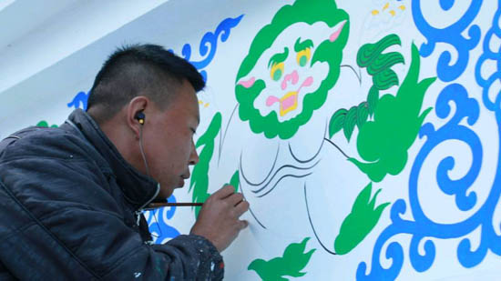 八座白塔,三个熟练的藏族画匠,需要花上六天的时间去翻新。几经询问之后得知,他们的工钱每日500块钱,学习藏式绘画也有十几年之久,而此刻一笔一划之间勾勒出的则是他们信仰中的“吉祥狮子”。