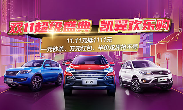 各大汽车品牌也借此良机推出了多重购车钜惠政策回馈消费者,对有购车意向的消费者来说,“双十一”无疑是一个不可错过的购车良机。 但如果你错过了这个购车良机也没关系,凯翼汽车多重钜惠仍在进行中,给消费者最简单直接的实惠,定金百倍翻番,三万元购车好礼享不停,让你以最优惠的价格买到心仪座驾。 11元整车订金宝贝的用户,下订凯翼炫界或凯翼X3即可直接享受整车1111元的购车抵用金,畅享百倍翻番。