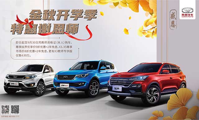 学生每一点成长,都离不开老师们的辛勤付出,在第36个教师节来临之际,为了感恩回馈每一位教师的辛勤付出,9月10日起,凯翼汽车开启“金秋开学季 特惠谢恩师”系列活动。 本次活动将针对广大教师消费者推出一系列专属购车优惠,为广大教师消费者带来更多元、更优惠的购车选择。 99万元的基础上再享9折优惠,同时还可享受至高5000元/辆的金融贴息、至高5000元的置换补贴,且终身享受价值1000元免费基础流量,在此基础上再送5年每月10G娱乐流量,除此之外购凯翼炫界还可终身享受价值6000元的每年2次免费基础保...