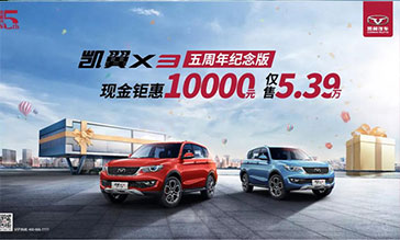 据悉, 8月28日是凯翼汽车品牌的五周年纪念日,同时凯翼汽车也开启了“凯翼礼赞70华诞,购车享8重豪礼”的钜惠活动,献礼国庆答谢消费者。 活动期间,凯翼汽车推出凯翼X3五周年纪念版,现金钜惠10000元,仅售5。 凯翼X3作为凯翼汽车的明星车型,对于产品的打磨及配置的落实,诚意可谓满满当当。