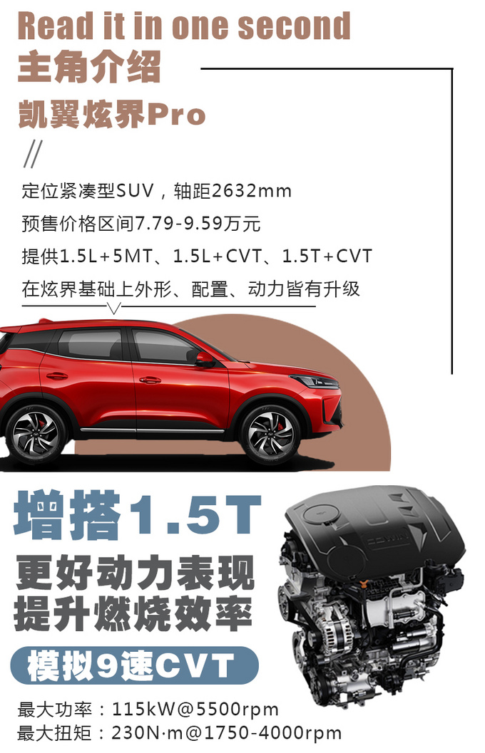 凯翼是奇瑞集团五大品牌之一,奇瑞主要提供技术支持,目前凯翼在售的车型主要面向年轻人市场。本次试驾的炫界Pro可以看做紧凑型SUV炫界的改款升级车型,提升之处涵盖整体设计、配置、动力。整体来说变化还是挺大的,尤其是在动力层面,以往炫界全系都只是1.5L自吸发动机,此次炫界Pro新增了1.5T发动机,意在提升整体的驾驶感受,更好的满足目前年轻消费者对动力的更高需求。