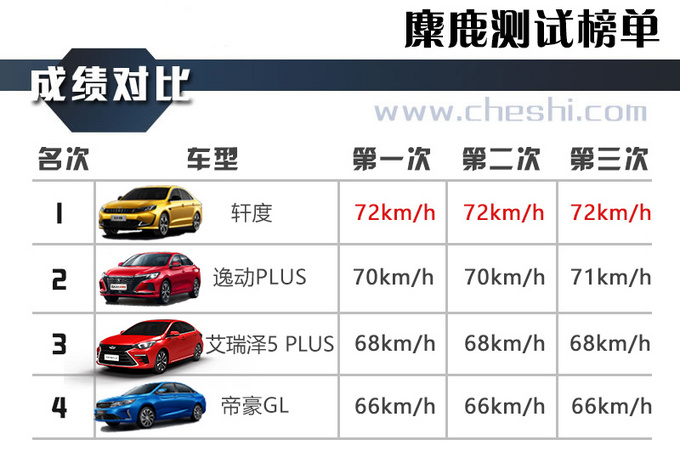 这四辆测试车型中,只有轩度为四轮独悬,它采用了成本更高的前麦弗逊+后多连杆式独立悬架的组合,再加上出色的底盘调校,与车身稳定系统的暗中保护,理论上能够很大程度弥补车身在极限操作下的不稳定性。而在整个测试过程中,轩度底盘给人的感觉很规整,也非常稳重,方向指向也很清晰,巡迹性很好,车辆轨迹基本是按照驾驶者想要的路线完成,这也给了驾驶者再次提高车速的勇气,最终以72km/h的成绩拿下麋鹿测试第一名。