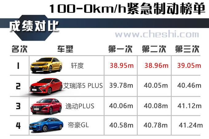 在日常的生活场景中,只有在特别紧急的情况下,才会出现如此重的刹车动作,较短的刹车距离对行车安全有着至关重要的作用,能有效地规避碰撞带来的危险。从100-0km/h的紧急制动成绩来看,轩度的制动表现还是出乎了我们的意料,达到了一个较高的水准,并且多次测试之后,热衰退的现象也不明显。此外,由于采用的是偏运动性底盘调教,在紧急制动瞬间前倾现象并不明显,整个刹车过程还是能给人很足的信心。经过三次测试,制动距离都相差不大,最终以38.99米的成绩荣获第一名。