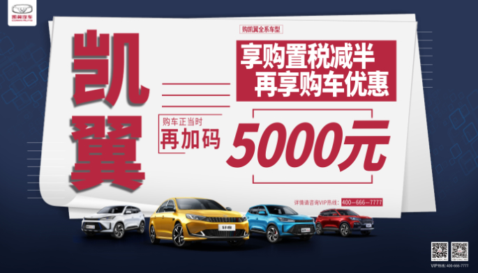 现购买凯翼汽车旗下车型,轩度、炫界Pro或炫界,享购置税减半,再享购车优惠——厂家额外补贴5000元。6月购车首付888元起,更有月供999元起分期购车活动。优惠力度前所未有,想要购车的抓紧“上车”。