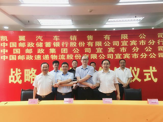 7月31日,凯翼汽车和中国邮政签署了战略合作协议,建立合作伙伴关系,未来双方将在金融、保险、仓储物流、品牌推广、企业采购等方面全面开展合作。中国邮政储蓄银行宜宾市分行行长周伟、中国邮政集团公司宜宾市分公司总经理熊静、中国邮政速递物流股份有限公司宜宾市分公司总经理张承志、凯翼汽车销售有限公司副总经理周强、宜宾凯翼汽车有限公司财务总监张昊等相关领导出席此次签约仪式,共同见证此次战略合作的达成。