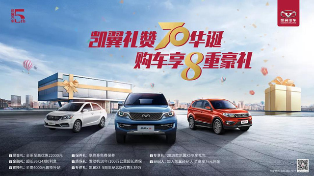 据悉, 8月28日是凯翼汽车品牌的五周年纪念日,同时凯翼汽车也开启了“凯翼礼赞70华诞,购车享8重豪礼”的钜惠活动,献礼国庆答谢消费者。活动期间,凯翼汽车推出凯翼X3五周年纪念版,现金钜惠10000元,仅售5.39万。在金九银十的佳期,引爆购车热情,尽享有车生活。
