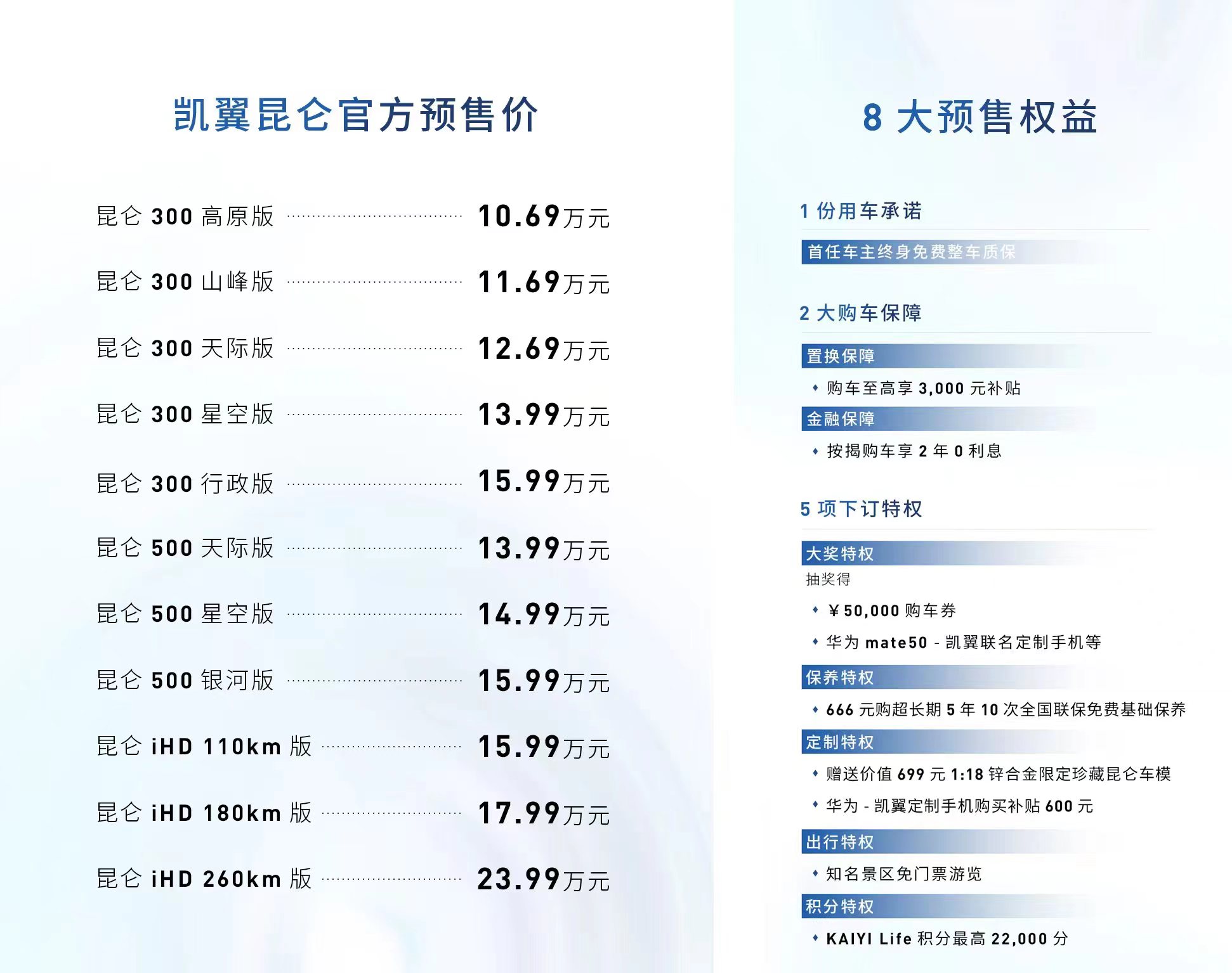 此次预售不仅给市场带来了很大惊喜,还一举打破了前段时间网上流出的昆仑预售价格谣言。预售权益显示,昆仑预售期间下订的用户,购车时不仅能拥有整车终身质保服务,还可享最高3000元置换补贴,按揭购车2年免息保障,更有5大超值预订权益等待解锁。为打消预订用户顾虑,凯翼汽车还做出承诺,今年年底前下订用户,因交付周期延长导致无法享受国家购置税减半政策的,增加部分由凯翼汽车承担。可以说,昆仑的预售权益对用户的照顾是方方面面,从售价到补贴,从用车到售后等多个维度,直接将用户的期待值拉满!