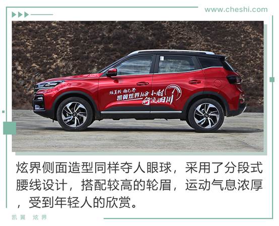 侧面来看,凯翼炫界的运动气息更加凸显,分体式腰线的勾勒,营造出张扬的个性,动势横飞。而当下流行的悬浮式车顶造型,黑红双色的配色,以及造型动感的18寸铝合金轮毂,都令炫界有着明显的年轻标签,潮流气息扑面而来。