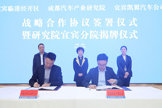 仪式最后,成都汽车产业研究院院长陈杰与凯翼汽车有限公司副总经理卢礼华分别代表成都汽车研究院与凯翼汽车签署了战略合作框架协议,随后共同为“成都汽车产业研究院宜宾分院”揭牌,此标志着“成都汽车产业研究院宜宾分院”正式设立。