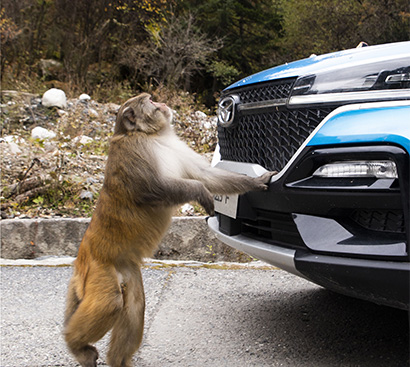 为了拍出猴子和凯翼炫界的画面,团体里的超哥拿出不少零食哄骗它们靠近凯翼炫界,但这里的猴子还存有较重戒备心,拍摄起来并不容易。几经周折,我们还是记录到了藏酋猴和凯翼炫界同框的画面。
