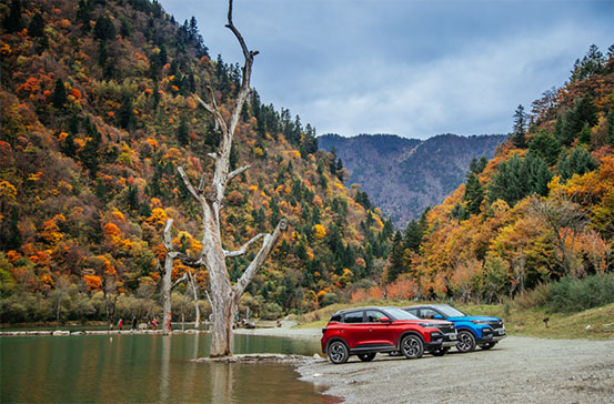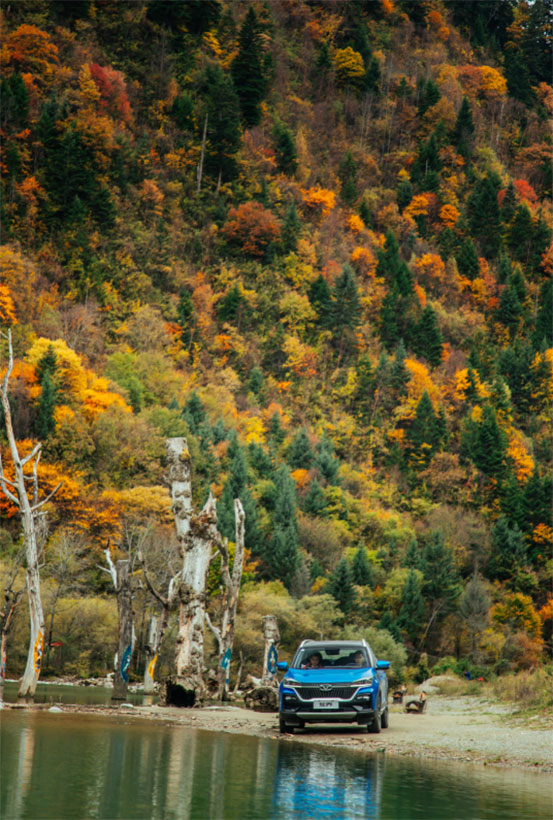 阳光下,五彩斑斓的红叶和彩林倒映在清澈见底的湖面之上,交相辉映,凯翼炫界的身影点缀其中,并不会给人以任何突兀感,相反,自然景色和工业设计之美在此时此刻融为了一体,彼此接纳又彼此成就。