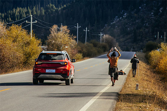 开着凯翼炫界,四位朝圣者的身影越来越远,我也只得放上几首应景的藏族歌曲,即便做不到经年累月磕长头的份儿上,也愿在歌声中得到一点点自我救赎。