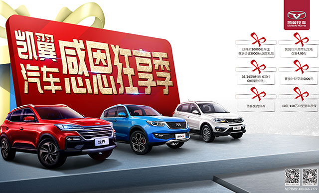 凯翼汽车每前进一步,都离不开用户的支持与信赖。 每取得一分成绩,都不忘对用户的感恩与回馈。 随着中秋、国庆双节临近,消费者的购车热情也日渐高涨,为感恩回馈消费者一直以来对凯翼汽车的支持与信赖,9月,凯翼汽车携手全国各经销商推出“凯翼汽车 感恩狂享季”系列活动,即日起至9月底,购凯翼汽车旗下明星车型——凯翼炫界、凯翼X3即可享受不同幅度和不同形式的优惠政策,此次活动惠及全国,将为广大消费者带来一场秋季购车饕餮盛宴。